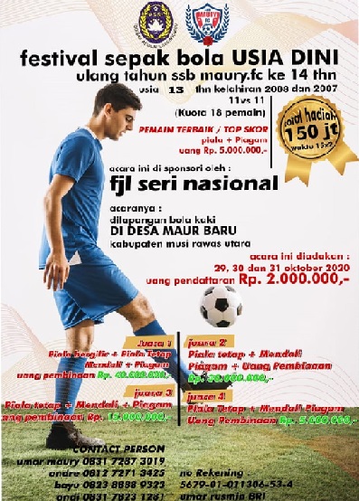 Semula festival sepak bola yang menggunakan format 11 vs 11 pemain dengan durasi waktu 2×15 menit itu akan bergulir di lapangan bola kaki desa Maur Baru, kabupaten Musi Rawas Utara, Sumatera Selatan pada 29 hingga 31 Oktober mendatang. Event yang diselenggarakan dalam rangka memperingati hari ulang tahun SSB Maury yang keempat belas ini akan memperebutkan piala bergilir dan total hadiah berupa uang pembinaan sebesar Rp. 150 juta.