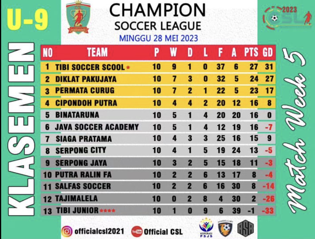 Saat ini Tibi Soccer School duduk manis di singgasana dengan koleksi 27 poin. Posisinya dibayangi Diklat Pakujaya (24 poin) dan Permata Curug. Sementara Cipondoh Putra (16 poin) yang menempati urutan keempat memiliki nilai sama dengan Bina Taruna dan Java Soccer Academy.