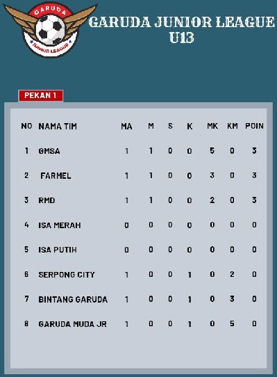 Berikut klasemen sementara Garuda Junior League pekan pertama:
