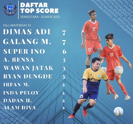 Sampai dengan matchday kesebelas, deretan tiga besar penjaring gol terbanyak (top scorer) diisi oleh Dimas Adi dan Galang, masing-masing dengan koleksi 7 gol. Kemudian diikuti Super Ino yang sudah menyumbangkan 6 gol bagi Ulekan. (RED)